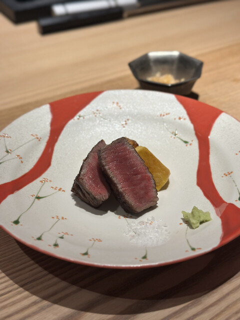 卯の花の天ぷらが添えられ、天出汁でいただきました。牛肉と牛蒡が調和した一品です。