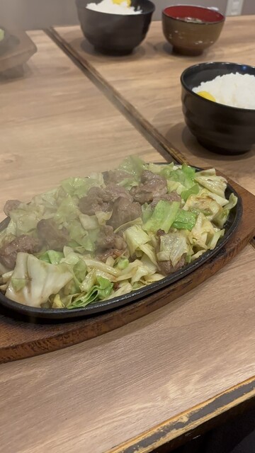 熱々の鉄板の上でジュウジュウと音を立てる豚肉とキャベツは迫力満点。
