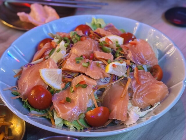 何人かとお邪魔しました。料理一つ一つそこまで高くないが量が沢山あり、その上味もおいしかったです!店員さんも愛想のいい方がいて気持ちよく食事会をたのしめました。店内薄暗く、すこしガヤガヤしていますがオシャレなのとお客さん同士の距離が近くないので気にならなかったです。ユッケとサーモンがめちゃくちゃ美味い!!