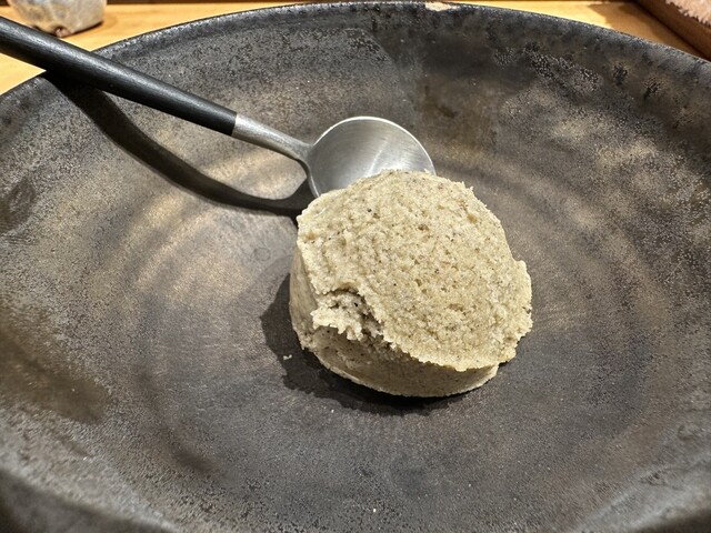 先ずはアスパラガスの根本から中央迄の皮を剥かない部分を浅く火を通し、コリコリ食感バツグンの一品目 絶品の火入れです♪ ヒマラヤ岩塩で頂いて、チョットお試し店主手作り醤油の搾り玉を天日干しした醤油塩でも頂いた。これも旨い