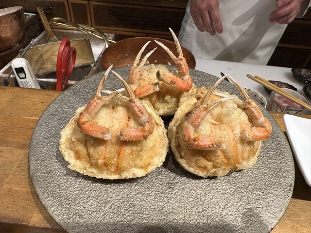 蟹の器(乾燥して漆塗りで仕上げ)に香箱蟹天ぷら