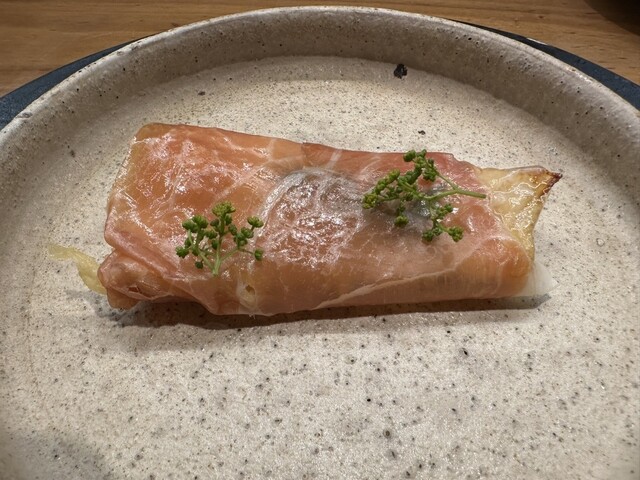 5年熟成豚ハム スライスが極薄なので口溶けが良く適度の塩味で口福でした♬