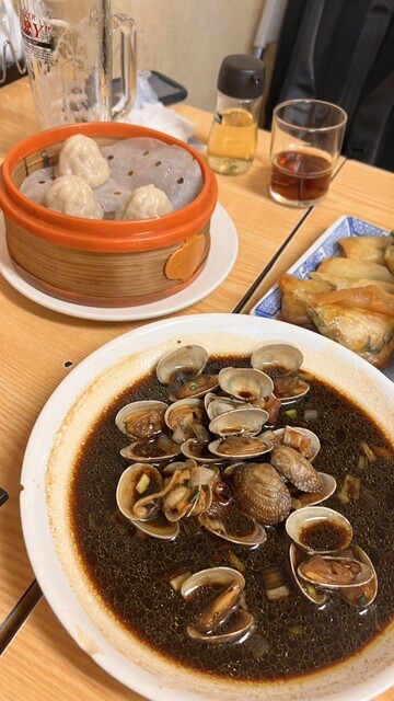豆乳の揚げパンと、アサリのスープ、豆苗炒め、辛い麺など。