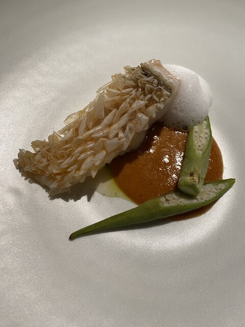 山口の甘鯛の松笠揚げにレッドカレーを添えて