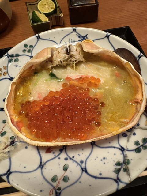 毛蟹の味噌とむき身がたっぷり入った甲羅焼き