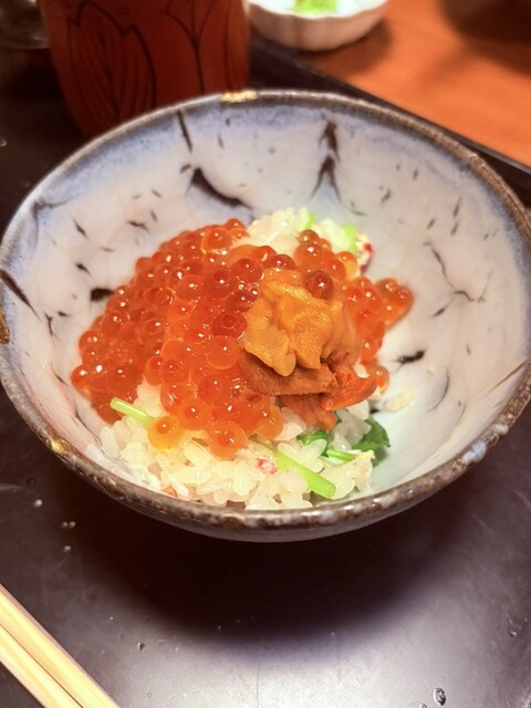炊き込みご飯(生うに、自家製いくら、海苔、わさび、ちりめん山椒、牛しぐれ、お漬物)