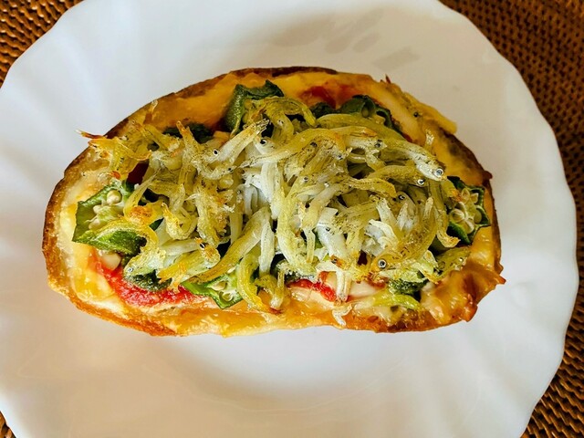 「チチニエッリ」…自家製ガーリックトマトソースとバジルソースの上にオクラとしらすがトッピングされたカンパーニュで美味しかった♡