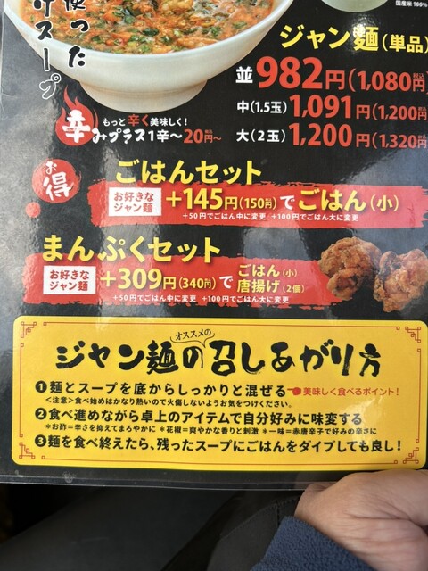 待っている間にメニューを拝見。店長おすすめと書かれていた「卵落としジャン麺1.5玉」に小ライスを注文しました。税込で1,480円です。