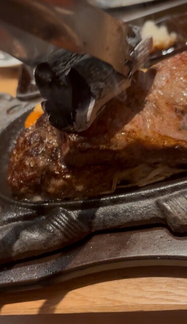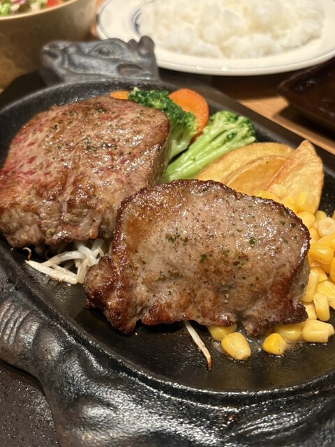 鉄板で提供されるステーキは焼き目が香ばしく、中はほどよいレア。