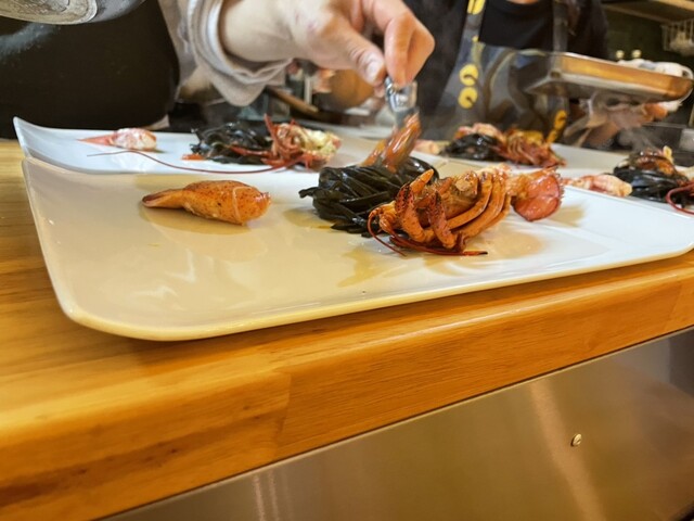 ここから目のまん前でシェフが生パスタをパスタから作ってくれました。最初イカ墨かなー?と思ったら竹炭を練り込んだパスタだそうで、行程を目の前で見ていたはずなのに、早すぎて!!気がついたらもう出来上がっていました。職人技ですね。トマトソースにオマール海老、バフンウニ。これが最高に美味しかった!パスタ自体ももちろん美味しいですが、ソースも具も贅沢使用。