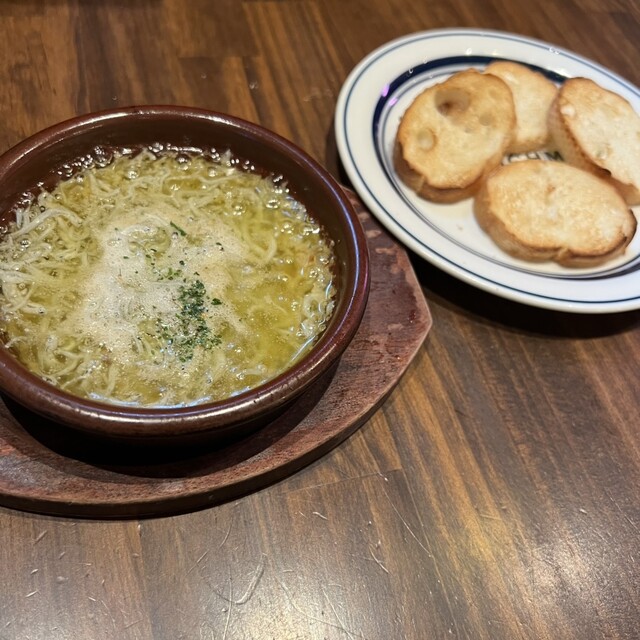 こちらのシラスのアヒージョは一口入れた瞬間にオリーブオイル、ニンニクの香りとシラスの魚の旨みが広がり美味しいです。バケットがサクサクでアヒージョをつけるとアヒージョの味わいがバケットに染みて2倍いや数十倍美味しくいただくことができます。シラスがたくさん入っていて最高です。