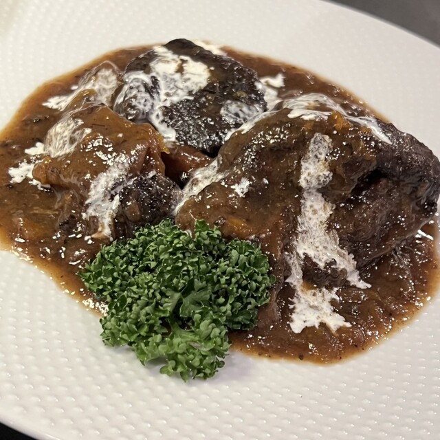 こちらの牛ほほ肉はレベルが段違いに美味しいです。箸で切れるほど柔らかく、お口に入れるとお肉の旨みがあって、尚且つとろけて美味しいです。ソースが濃厚でパンにつけても美味しいと思います。付け合わせのかぼちゃがとろけすぎて新感覚でした。