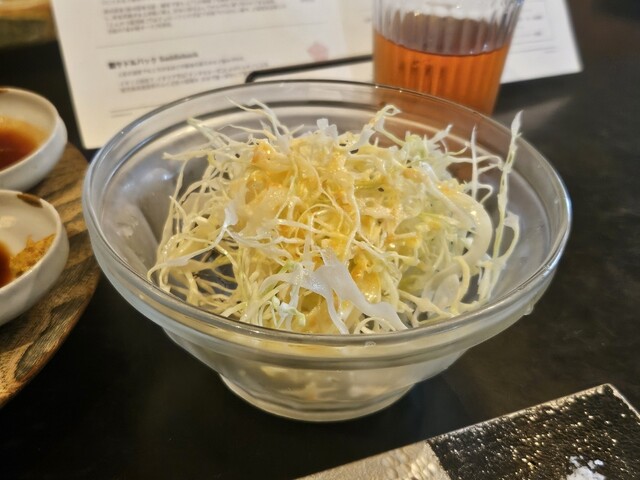 ご飯、お漬物、キャベツ、赤だしが付きます。それでは早速いただきます。