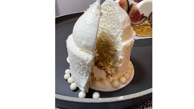 上品なホワイトムース真ん中からパッカーン️カットした時に中に隠れている美味しいの、一体なんだったのだろう主人も私も分からないまま食べ切っちゃいました