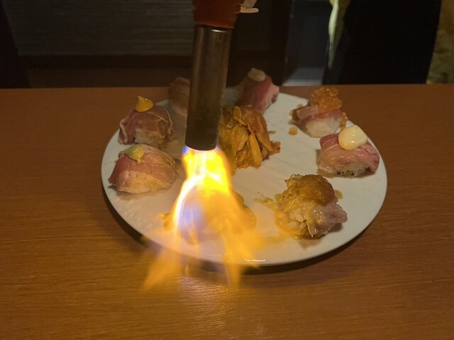 見た目から華やかでそれぞれポン酢、タレ、わさび、いくら、マヨネーズなどのってる具材が全部異なり、目の前で一品ずつバーナーで炙ってくれます。炙った後なので香ばしく美味しいです。真ん中のキムチを中心に好きなものを皆でシェアする楽しさもあるのでこれは注文必須ですね。