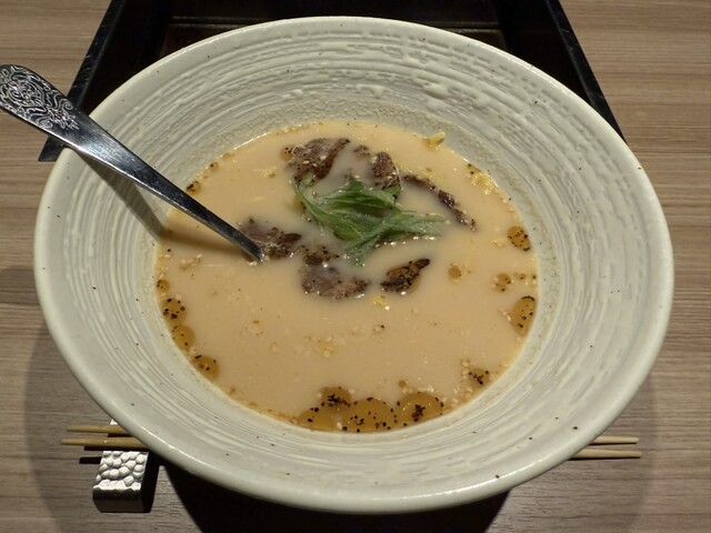 鮮やかな弾力ある卵を中心からゆっくり塗して、お肉と共に美味しく頂きました。滑らか食感で口の中でとろけていきます。トリュフの香りがほのかにするのも良いですね!