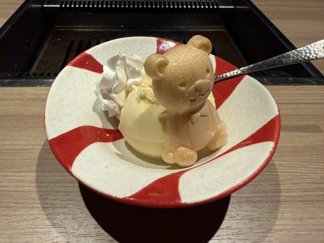 バニラアイスに生クリーム、クマさんの最中の皮が可愛く添えられています。可愛さだけでいうと本日の優勝かもしれませんね。アイスも何気に大きめで満足です。