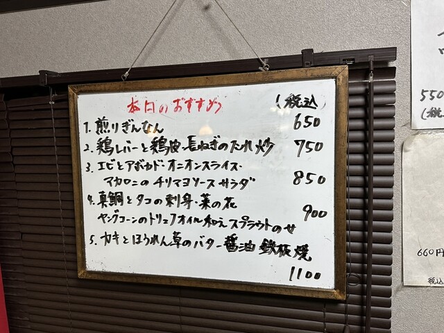 まずはホワイトボードに書かれた本日のおすすめからスタート。鶏レバーと長ネギ炒め、エビとアボカドのサラダ、真鯛とタコの和え物を注文。毎回このおすすめメニューを楽しみにしていますが、今回も期待以上。どれも素材の良さが活かされ、ひと皿ごとに完成度の高さを感じます。