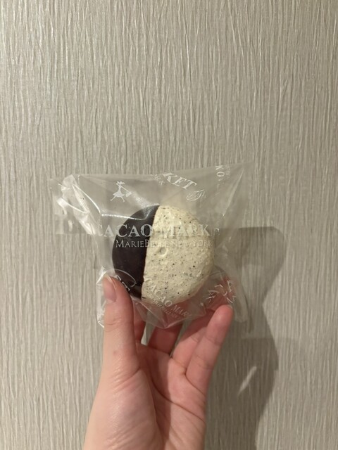 ピローは、大きなマカロンにチョコレートがかかっていて想像以上に満足感があります。マカロンの外側はパリホロで、少しこぼしやすい感じです。