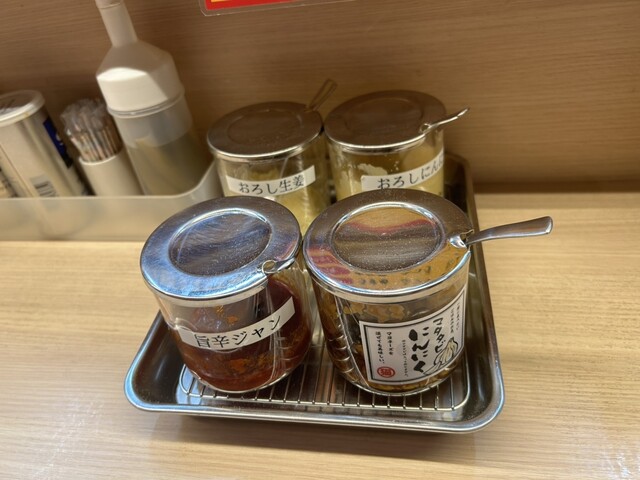 刻みニンニクやおろしニンニク、おろし生姜などもおいてあります。またニンニクがめっちゃ合います。