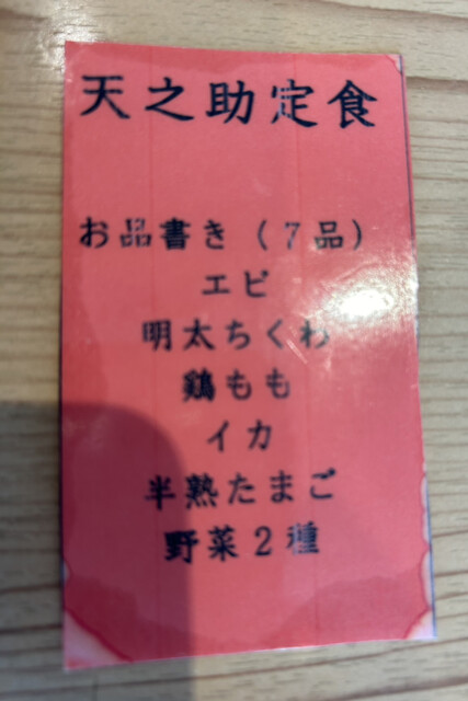 今回は天之助定食1,100円(エビ、明太チクワ、鶏もも、イカ、半熟卵、野菜2種の7品)を購入。