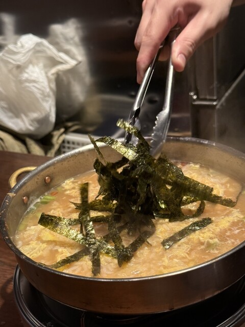 今回のメイン。何とか予約が取れてお邪魔出来た。広くはなかったがカウンターでキッチンの活気を感じる事が出来た。もつ鍋の九州しょうゆ味とパリパリピーマン。お通しは春菊の茶碗蒸し。茶碗蒸しがめっちゃ美味しくて最高のスタート。ピーマン自体も美味しいし肉味噌も絶品。もつ鍋はぷりぷりもつの脂と甘めの九州しょうゆがベストマッチ。ポイントは揚げた牛蒡。最高の存在感だった。〆はお店おすすめの雑炊で。接客も感じが良くまたお邪魔したい名店。