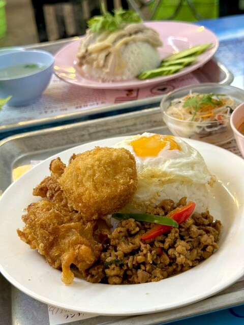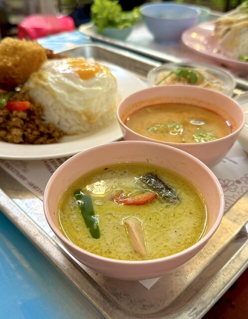 気になってたお店に初訪問。開店時には数名の待ちだった。お店はかなり広くて、タイ料理のレストランとは少し感じが違ってワクワクするような雰囲気。ランチメニューからバンコクランチとカオマンガイ、土日限定メニューからカニのカレー炒めをお願いした。相棒が好きなパクチーも小皿で追加。バンコクランチは品数も多くて、スゴいボリュームだし、どの料理も美味しい。カオマンガイも濃いめのソースで刺激がある。カレー炒めはめっちゃ美味しい上にカニと卵の量がスゴくて、コスパがいい。タイへ行った事は無いけど、音楽やお店の雰囲気で旅行気分。お店の方も丁寧でフレンドリー。またすぐに行きたくなる、おすすめのお店。