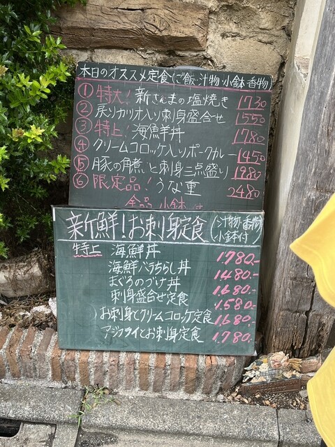 お店の外の立て看板が海鮮を売りにしていると
