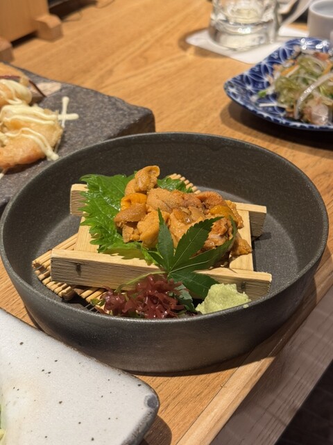 注文したのは生ウニ、鰹藁焼き、馬肉ユッケ、黒ムツ刺し(半身)、黒ムツ焼き(半身)、しいたけ焼き、さつま揚げ、枝豆。