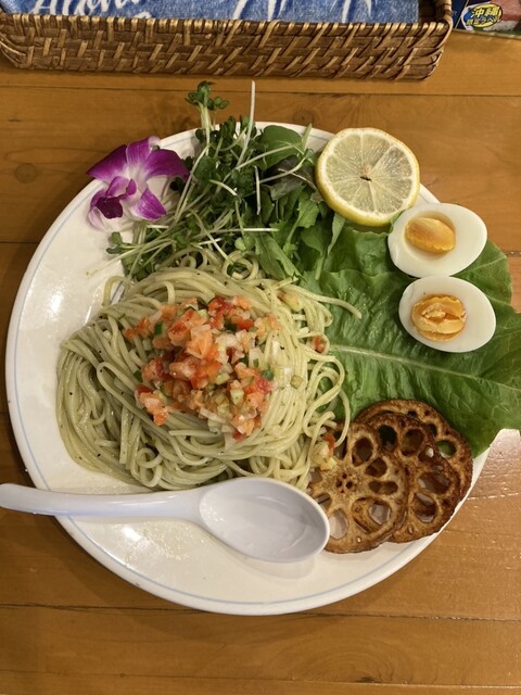 池袋でハワイのカフェのような店内で食べるItalian風フルルの冷やしSOBA♪