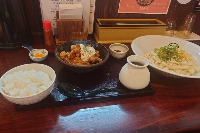 定食のセットのうどんの量を中盛り50円プラス、冷たいうどんのぶっかけにし、ご飯は普通盛りにしました。