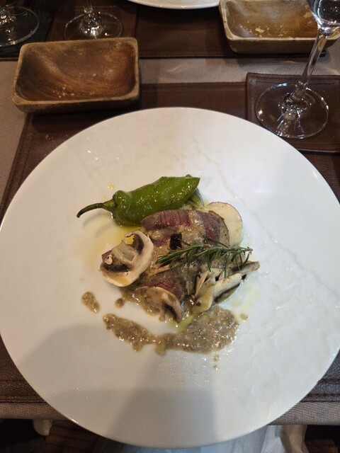 コースはサラダ、パン(フォカッチャ)、前菜(カルパッチョ風でかなりのボリューム)、パスタ(ハーフサイズ)、メイン(黒毛和牛のポルチーニソースがけ)、ドルチェ(3種から選択)、それにワンドリンクサービスがついており、スパークリングワインを注文しました。パスタは生麺と乾麺から選択可能です。