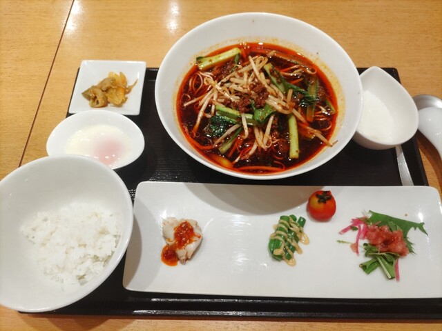 娘はサンラーメン 温玉付き 1400円 こちらも見た目より辛くない そして酸味がいい感じ 麺、モチモチ♪