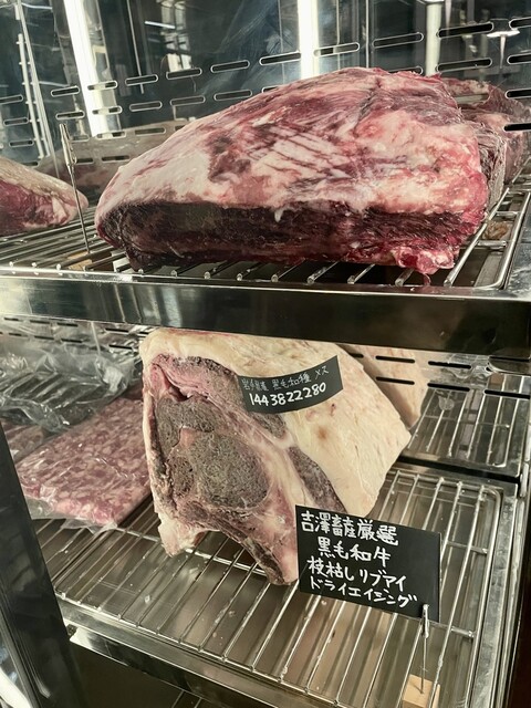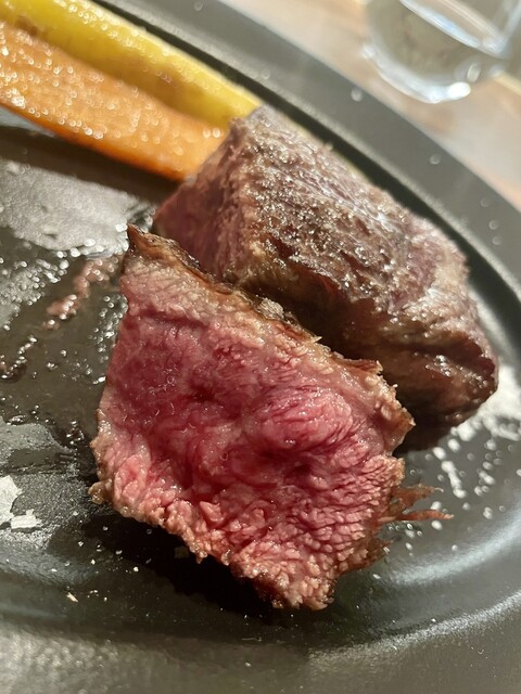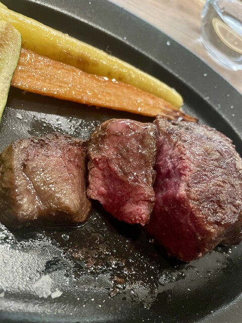 ・熊本県産 赤牛のイチボ メインのお肉、ブラジル風と言えばいいのか大きな肉塊で焼かれ、そのまま提供されます、決して固くはありません、しっかりと噛み締める系で肉感と風味が口いっぱいに広がるとても好みの肉質でした。野菜の付け合わせもたくさんありしっかりお腹いっぱいになりました