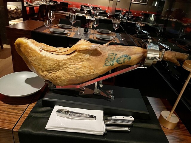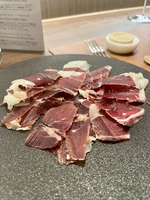 ・モンテサーノ ハモンイベリコ48か月熟成 店内に鎮座する原木からの切り落としです、とてもマイルドで口の中でとろける柔らかさも併せ持ちます