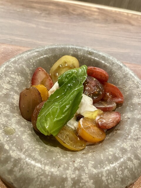 ・ブラッターチーズのカプラーぜ(冷前菜) デザートのような甘いチーズ、野菜の他に苺なども入っておりトマトも甘さが引き立つものを選んでいるようです、とてもチーズに合います