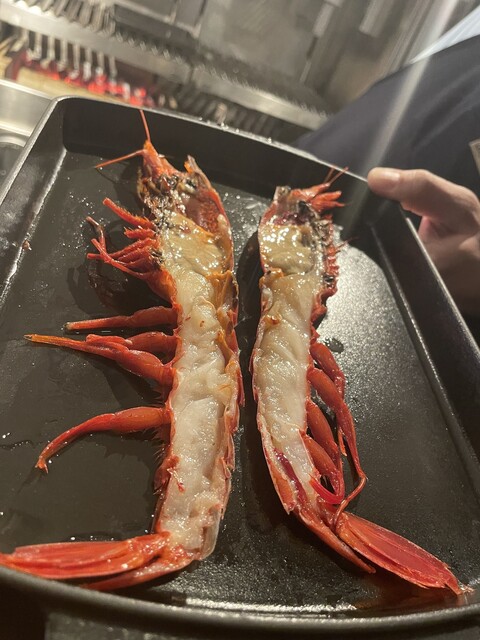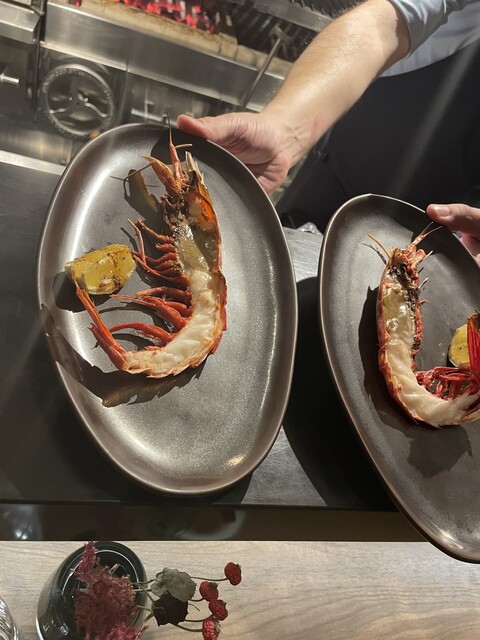 ・薪焼カラビネーロ 赤い悪魔と呼ばれるエビ、味噌がたっぷりで身は表面だけ火が通ったレアに近い状態で提供される、合わせて食べると最高です!!