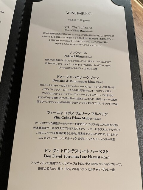 ペアリングについてはスッキリとしたシャンパンから始まり、白ワイン中心の組み立てでとても料理が引き立つお酒でした。
