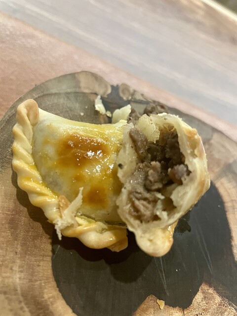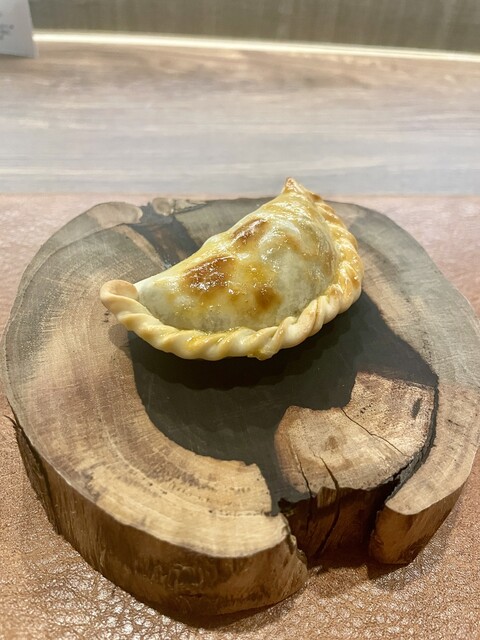 ・(前菜2種)エンパナーダ 餃子のような見た目ですが肉詰めパイです、バターの香りがよくひき肉は中南米的味付け