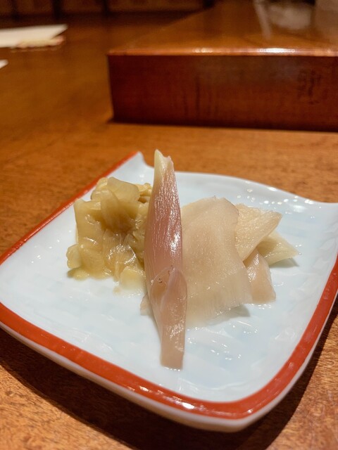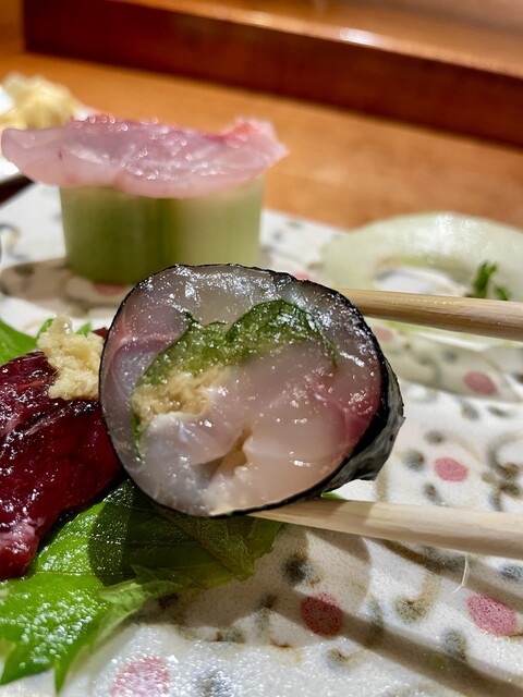 ・鯵のガリ巻き アクセントに生姜が効いていて、脂の乗ったアジとのバランスが素晴らしい。