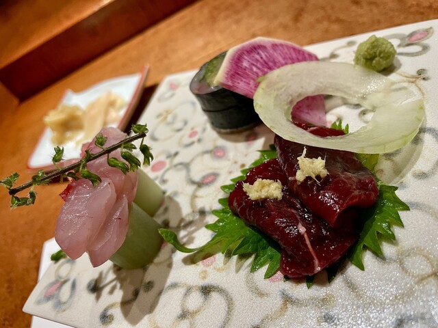 ・くじらの生姜醤油 クセのない赤身で、上品だがワイルド感も残っている。