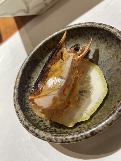 ・車海老 茹でか生を選べる、生チョイス。プリプリの食感と自然な甘みが際立つ。頭は焼いてくれて余すことなく味わえる。