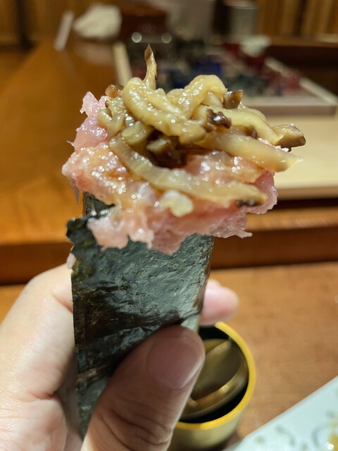 ・握り〆にトロタク手巻き 脂の旨味とたくあんの食感がクセになる一品。