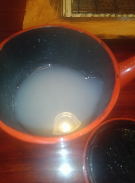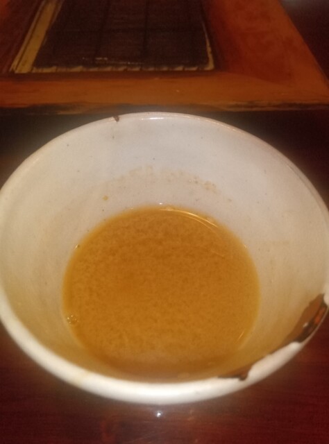 蕎麦湯を入れて飲みますと、味噌入りの胡麻ダレの麺つゆが、滲んで見た目が、まるで味噌汁のようです。