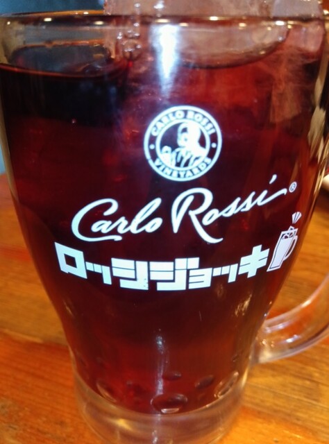 何故だかジョッキの赤ワインの中に氷が入っています。