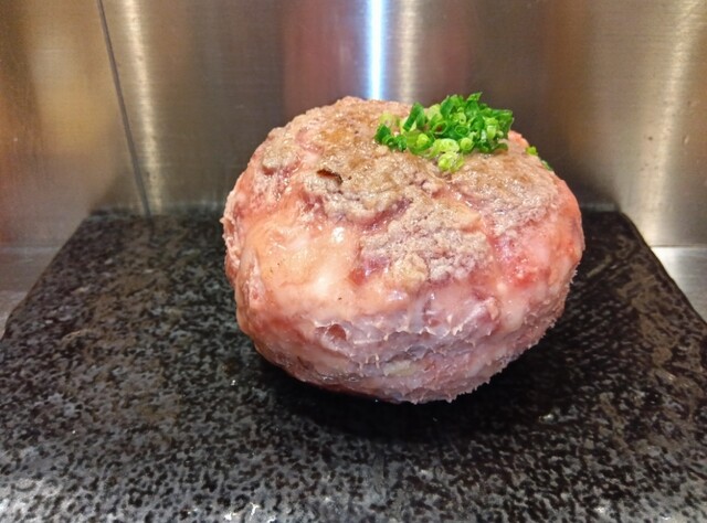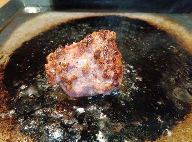 ガーリックチップ、ピンク色の岩塩と胡椒、和牛の挽肉、茶色いタレ・・・等々を入れて、焼いてくれました。