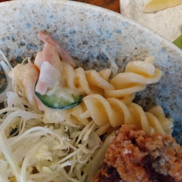 マヨネーズがかかったキャベツの千切りと少量のマカロニサラダのようです。