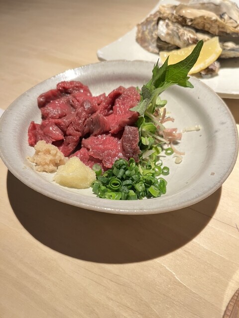 他には青さと鳥ナンコツのポテトサラダ、馬刺し、焼き牡蠣と飲み物はビールを注文。