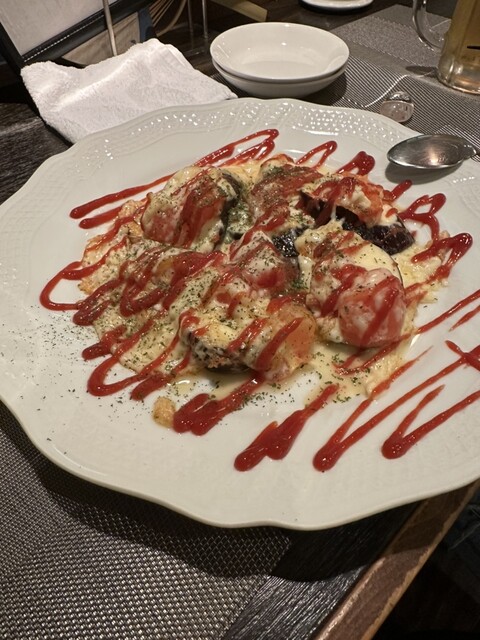 家でたらふく食べいったので、お料理はナスとトマトのなんか チーズがすごく美味しい♡