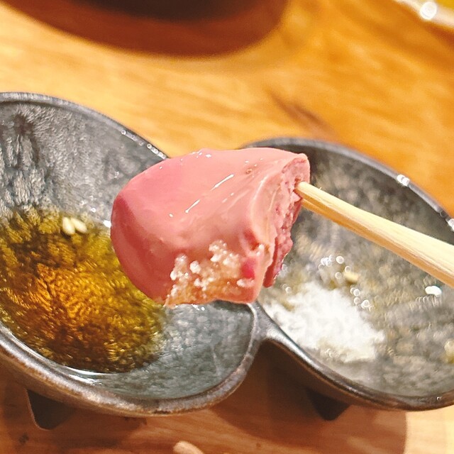 カウンターに座ったんじゃが目の前でじっくり焼く姿からもう圧倒されて雰囲気から楽しませていただいたのぉ!お肉からゆっくりと垂れる脂。炭に落ちじゅわっという音。五感で楽しむ料理という感じがしたのぉ!